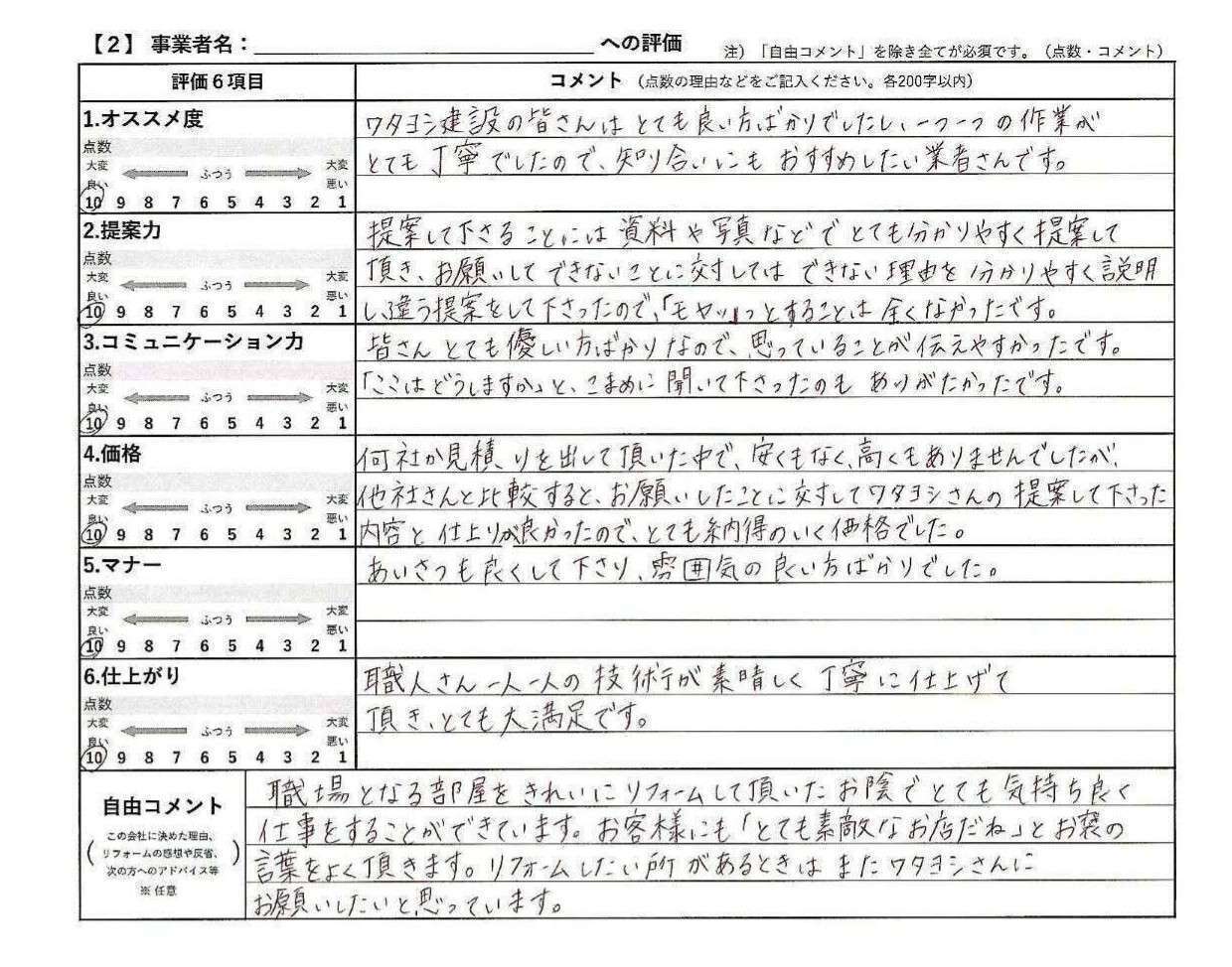 何社か見積もりを出して頂いた中で、安くもなく高くもありませんでしたが、他社さんと比較すると、お願いしたことに対してワタヨシさんの提案して下さった内容と仕上がりが良かったので、とても納得のいく価格でした。