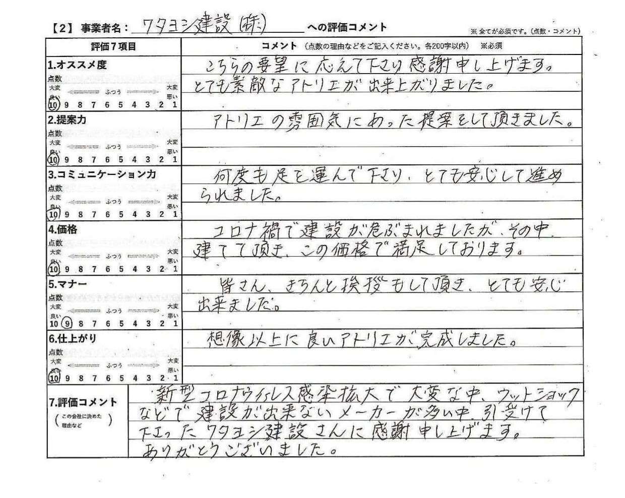 今回は、コロナ禍やウッドショック(木材価格高騰・不足)という困難な状況下で、「アトリエ」の建設をご依頼いただいたお客様より、全ての項目で満点という心温まる評価をいただきましたのでご紹介いたします。