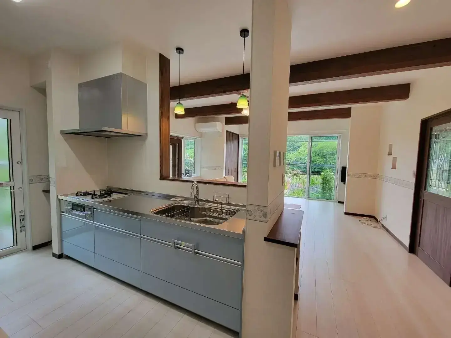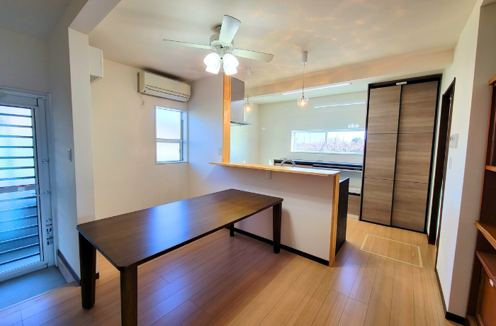 築43年の中古住宅の1階をフルリノベーション。電気温水器があった勝手口を塞いで造作の収納棚を新設し、キッチンスペースへ統合。無駄なく広々と使える明るい空間になりました。