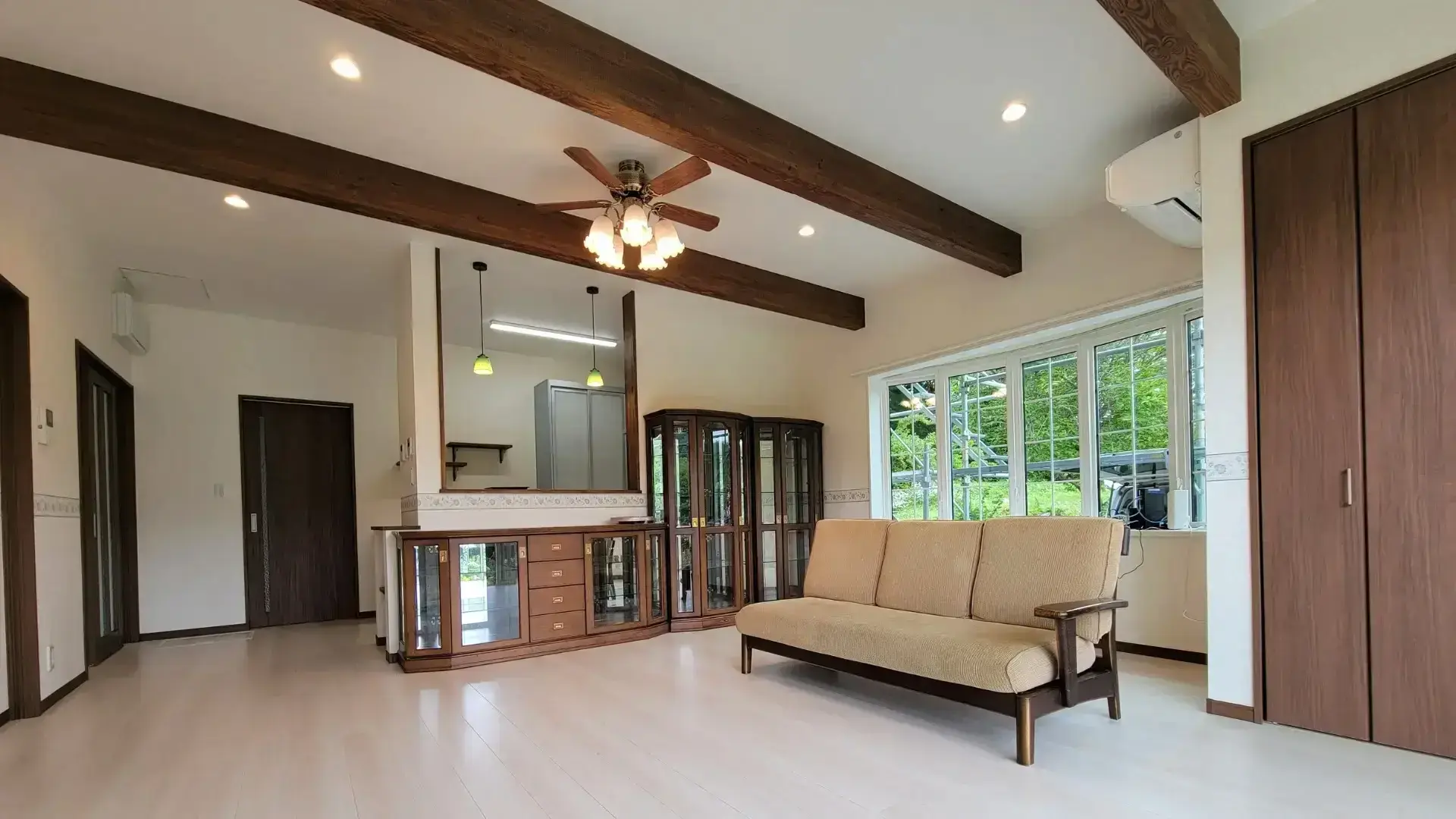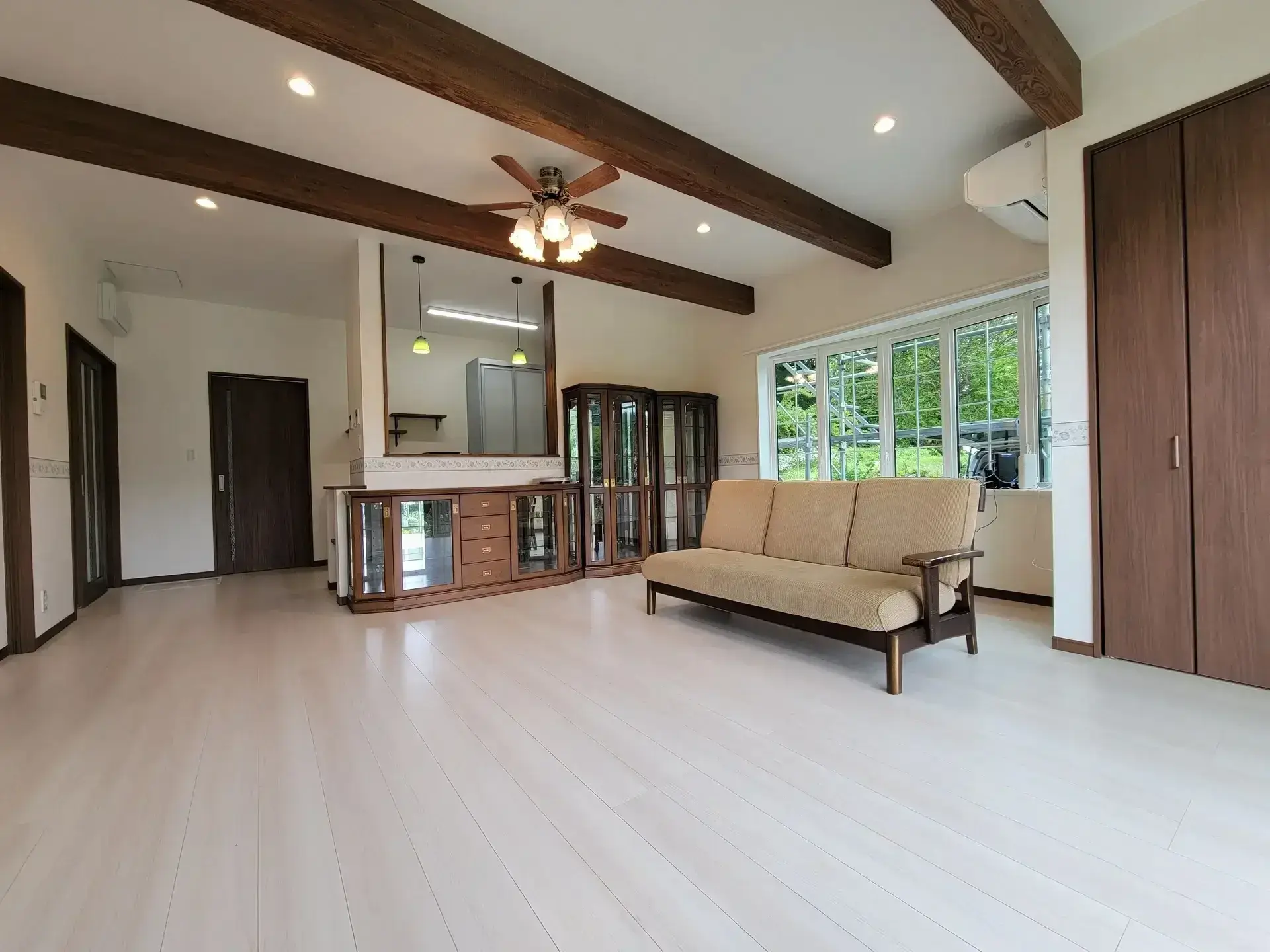 築30年以上の貸していたマンションをフルリノベーション。撤去できない既存部分と新しい内装の色味を合わせることで、一体感のある広々とした美しいLDK空間に仕上げました。