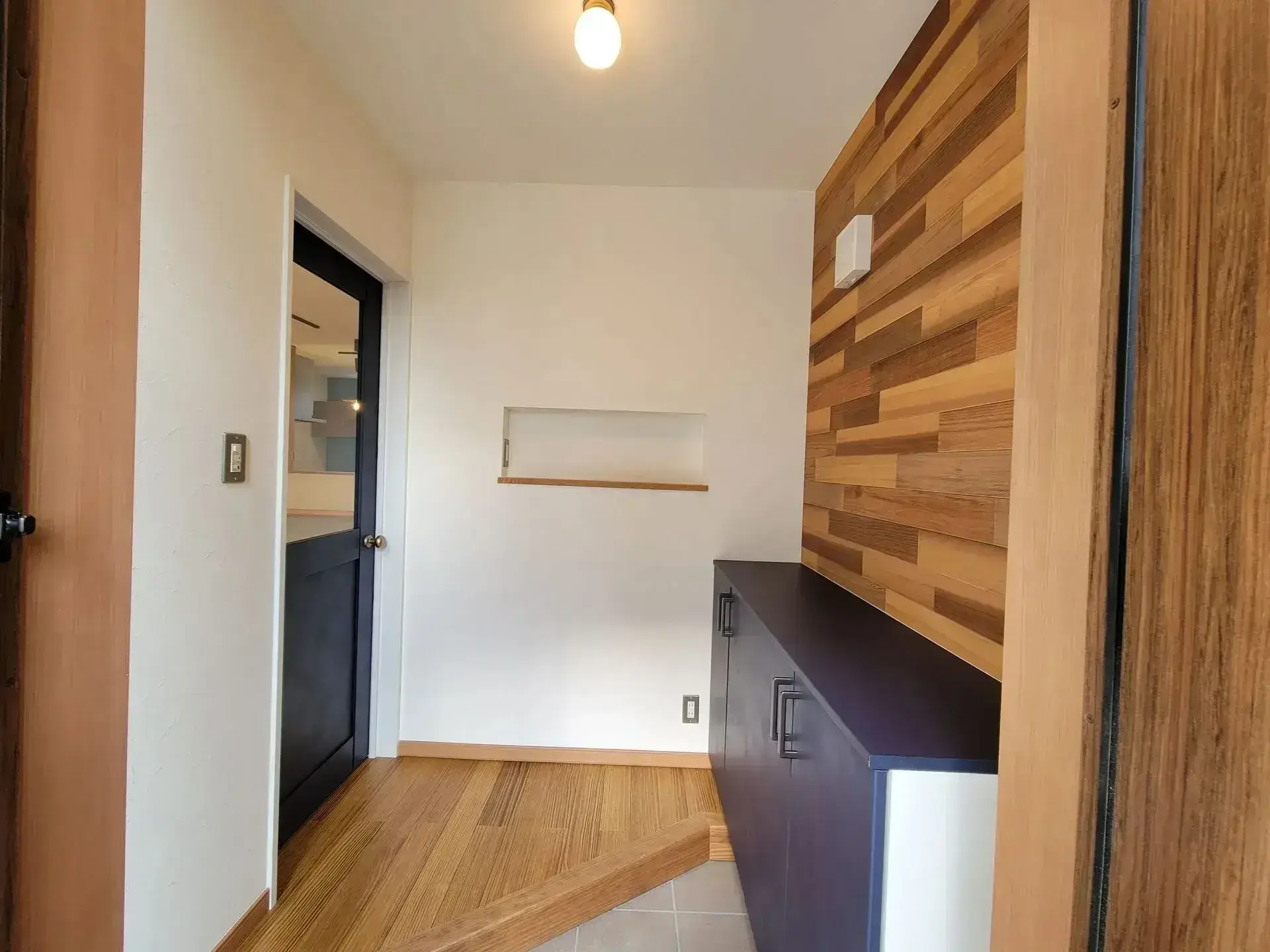施主様のこだわりを形にした玄関スペース。木目調アクセントウォールや個性的な収納、ニッチが空間を演出します。国の補助金制度や節税制度を積極的に活用し、お得に理想のリノベーションを実現しました。